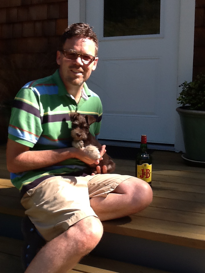 "Photo #2: Is me, also at the cottage, with my new puppy. PS I don't normally have booze on the front porch, "a friend" brought it."...